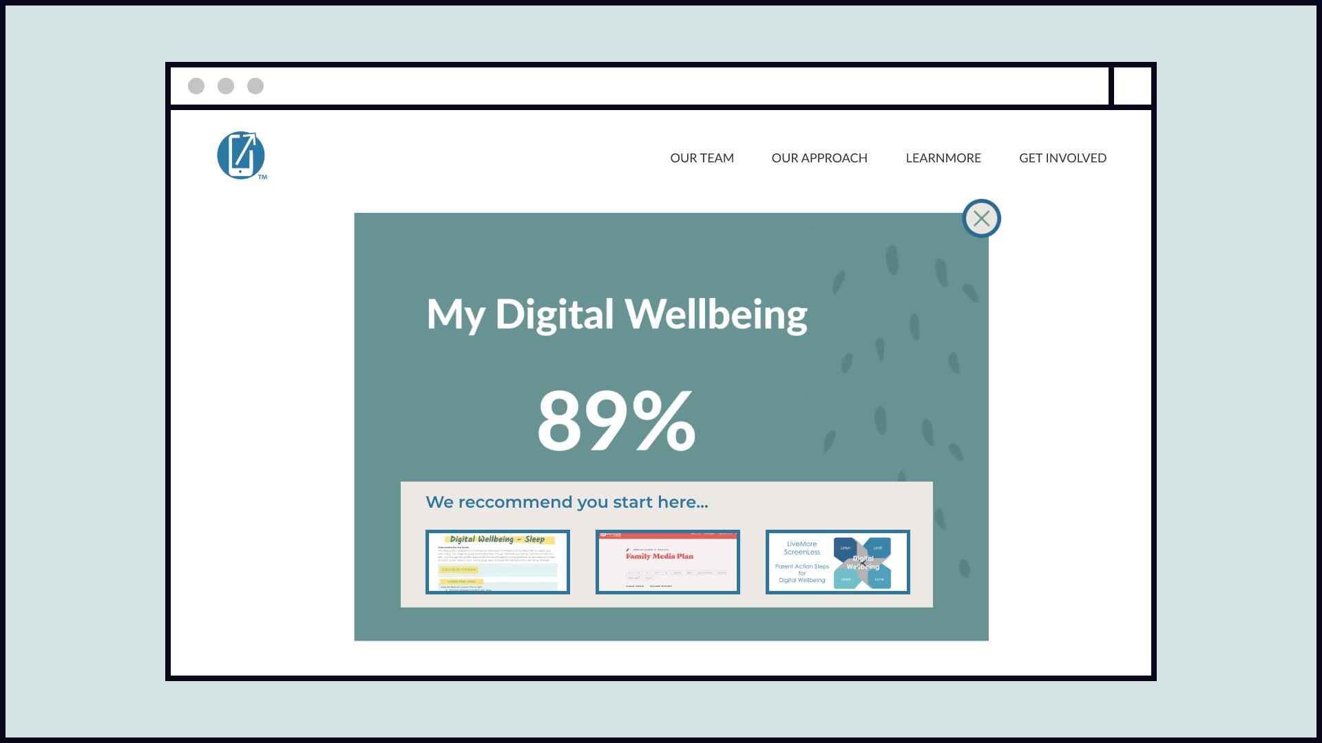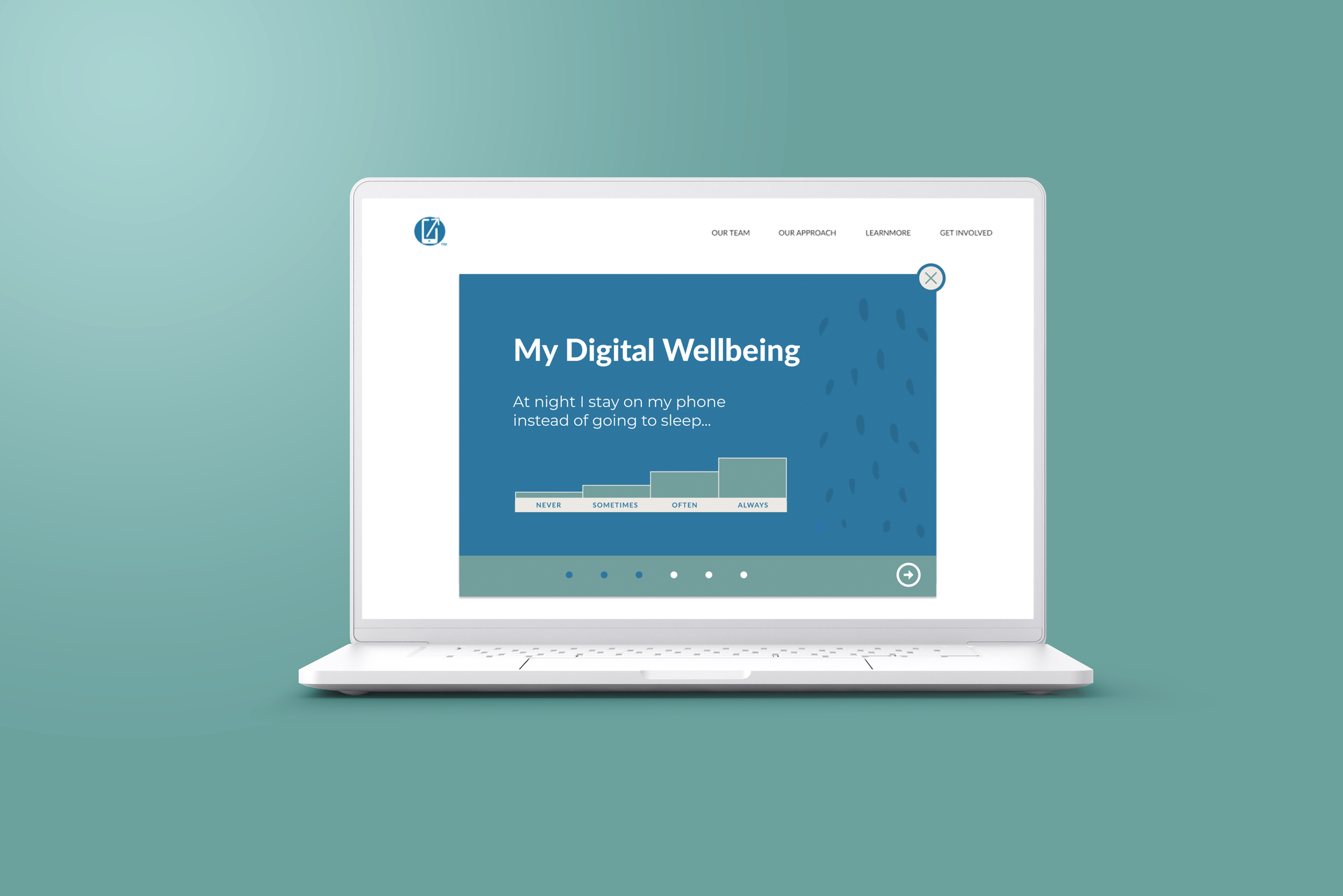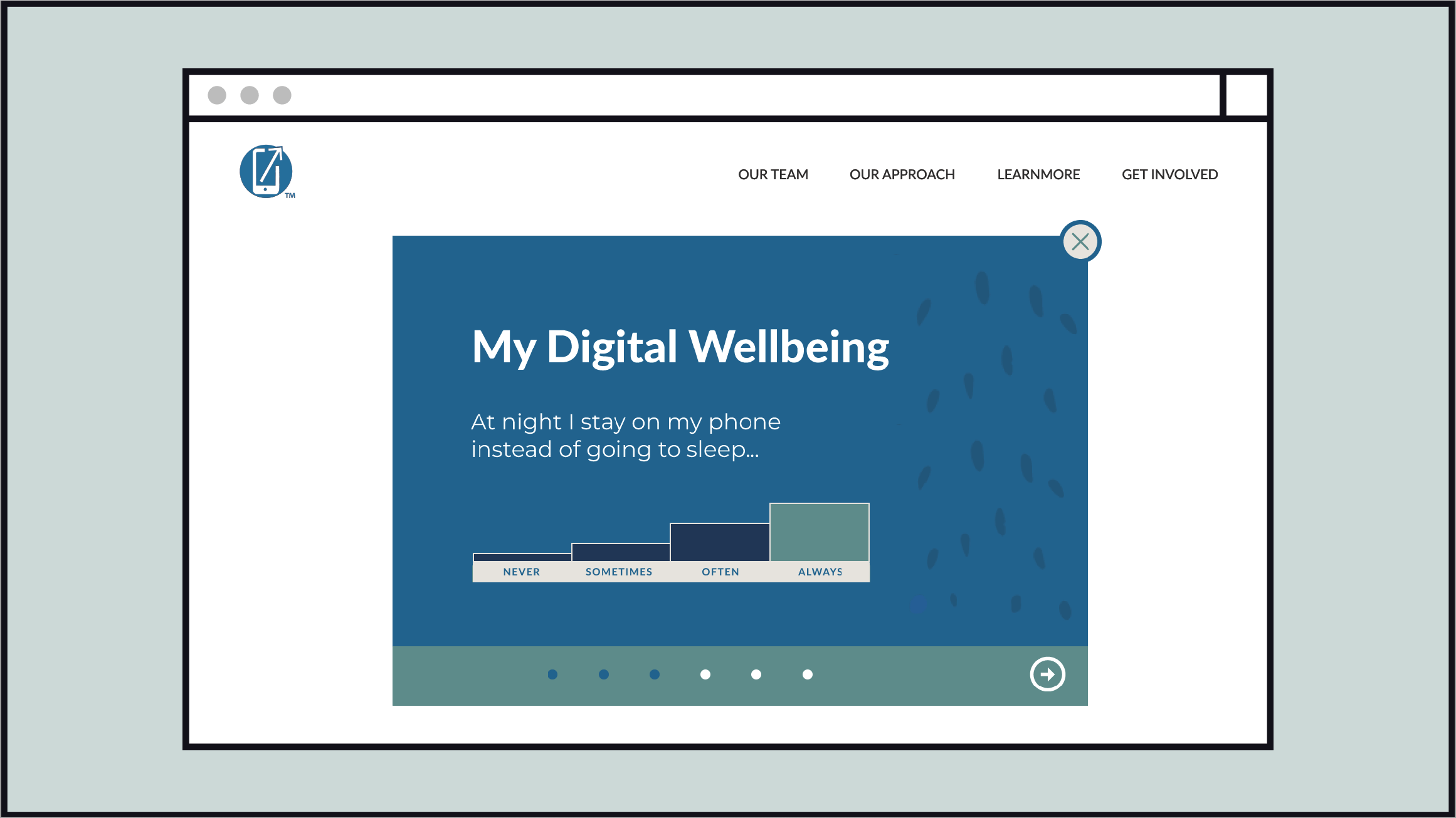 The “My Digital Wellbeing” assessment would be made available to all users. A survey like this would help users gain a better understanding of their personal relationship with technology. It would include 5-10 prompts, written around research backed problem areas, like sleep, cyber-bullying, mental health, among others. For example: “At night I stay on my phone instead of going to sleep…”