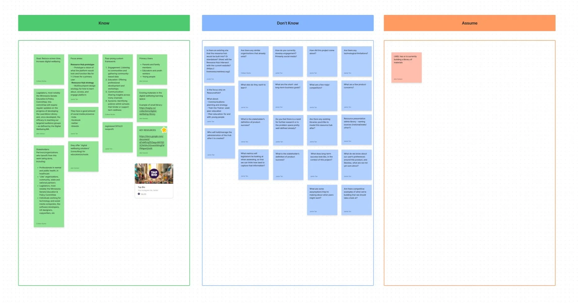 To begin, my teammates and I needed to better familiarize ourselves with LiveMore ScreenLess and the scope of the project. We did this by perusing the organization’s current website, sifting through client-provided research materials, and conducting a competitive analysis. After reconvening, we conducted a know, don’t know, assume activity to gather and prioritize questions in preparation for our Stakeholder interview.